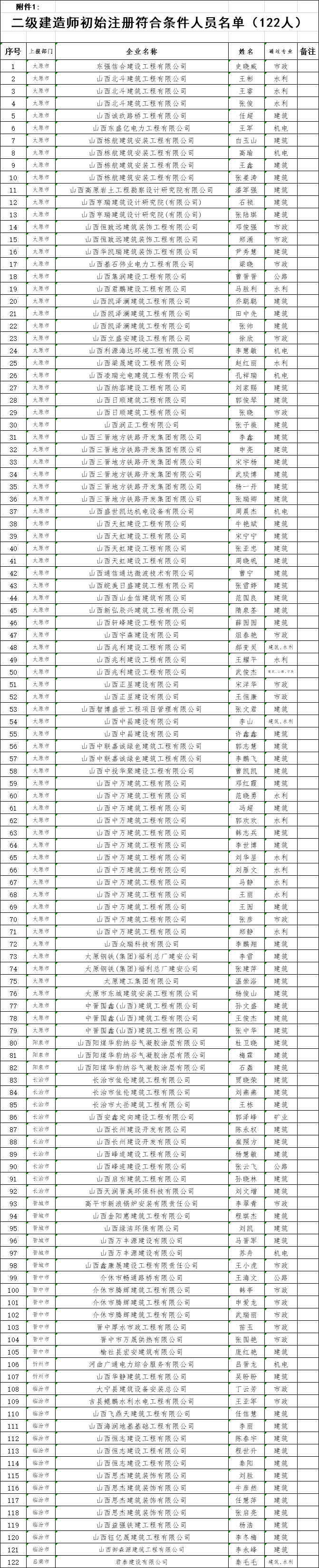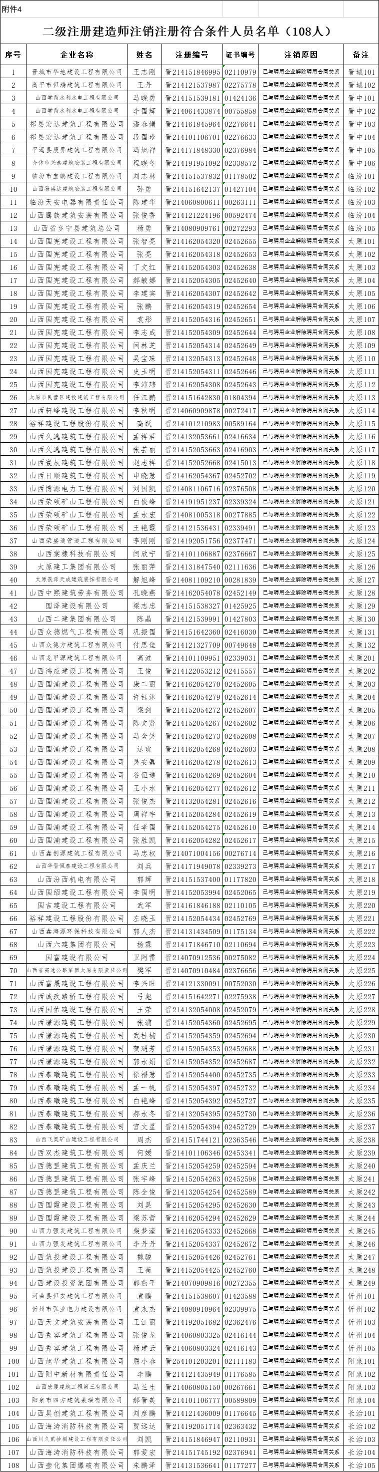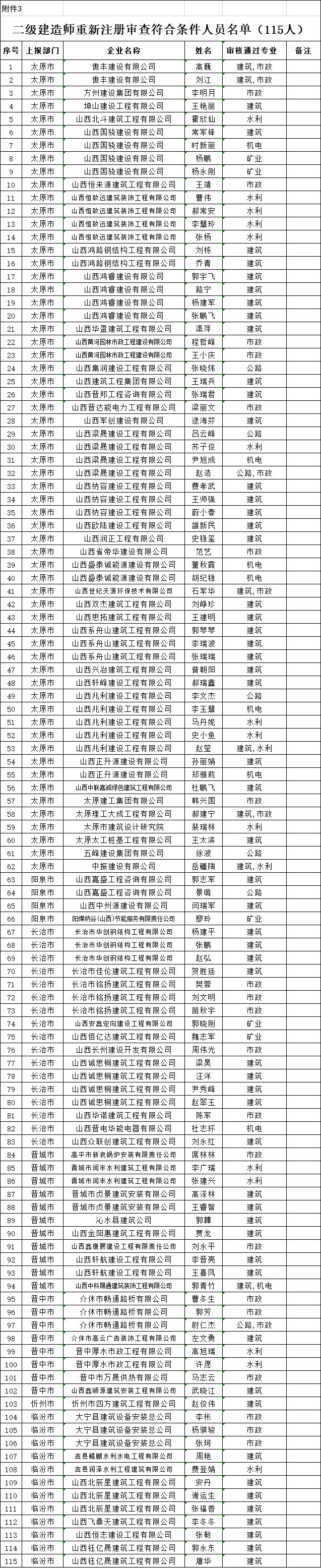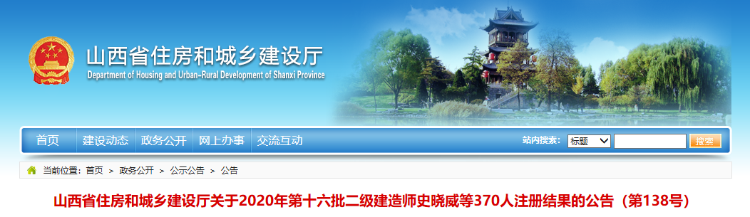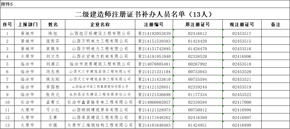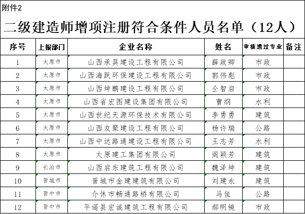 按照《注冊建造師管理規(guī)定》(建設(shè)部令第153號)、《關(guān)于開展二級建造師注冊工作的通知》(晉建審字〔2007〕473號)和《山西省住房和城鄉(xiāng)建設(shè)廳關(guān)于進一步做好二級建造師注冊審查工作的通知》(晉建辦綜函〔2015〕719號)的規(guī)定,根據(jù)有關(guān)部門上報的審查結(jié)果,經(jīng)審核,準予史曉威等122人二級建造師初始注冊申請,準予薛政卿等12人二級建造師增項注冊申請,準予高巍等115人重新注冊申請,準予王志剛等108人注銷注冊申請,準予陳旭等13人注冊證書遺失補辦申請,陳旭等13人原注冊證書失效,特此公告。